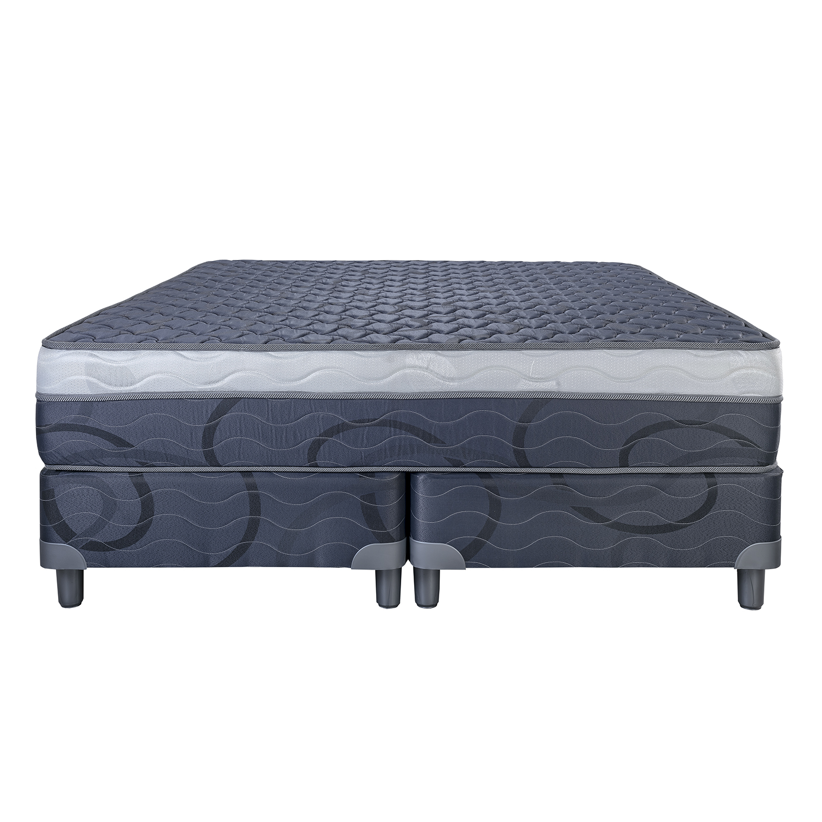 Conjunto BIG BEN. Fabricado con espuma de alta densidad . Colchón altura 26cm . Soporta 110 Kg. por lado. Con base de sommier en 20cm de altura y patas de madera. Euro Pillow reforzado. Dos plazas y media.